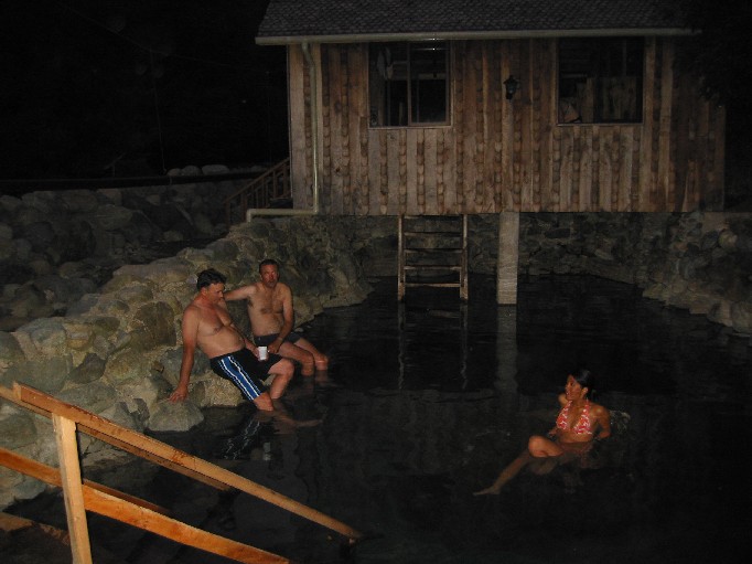 Well earned relaxing time after a shaking day on the bike. Leslie being joined by John and Tom, two americans guys we met in Pucon.