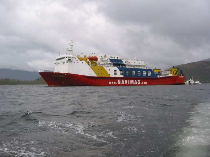 This chic boat took us, together with 300 other people and a lot of cargo, from Puerto Montt to Puerto Natales in 3 days and nights. There was lots of relaxing, sightseeing, socialising and partying going on (incuding a "rock and roll" party on the second day, when we entered the open sea and the boat started to move quite a bit - walking on the lower decks wasn't very safe anymore, because of all the sick people on the upper deck...(.