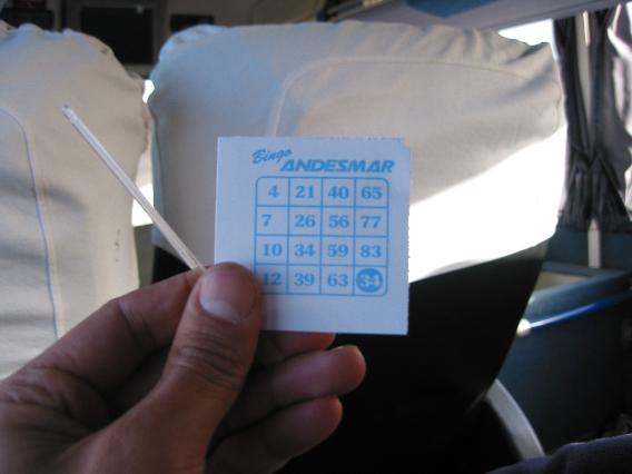 Surprising, what the buscompanies invent to keep their customers happy and entertained... The highlight of the 13 hour bus trip from Mendoza to Buenos Aires with Andesmar was the Bingo - hey, doesn't that raise memories of the Navimag trip..?!
