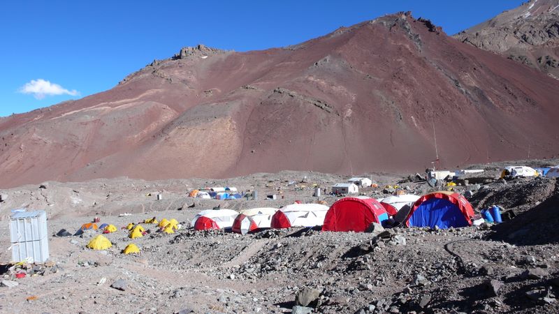 Blick über das Basecamp: Im Vordergrund die 'Domes' von Inka, unserem Tour-Operator, links unsere Zelte und im Hintergrund der Cerro Colorado, den wir als ersten Akklimatisationsberg besteigen.