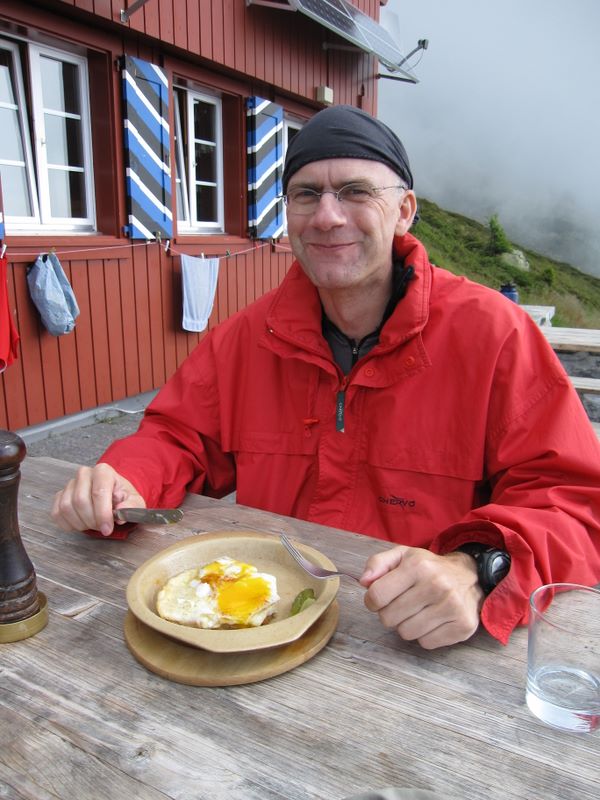 Jürg geniesst die legendäre Chässchnitte vor der Salbithütte