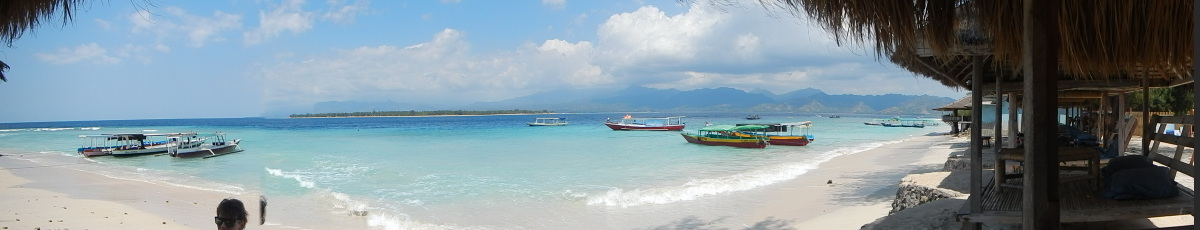 Panoramic view from Gili Meno towards Gili Air and Lombok