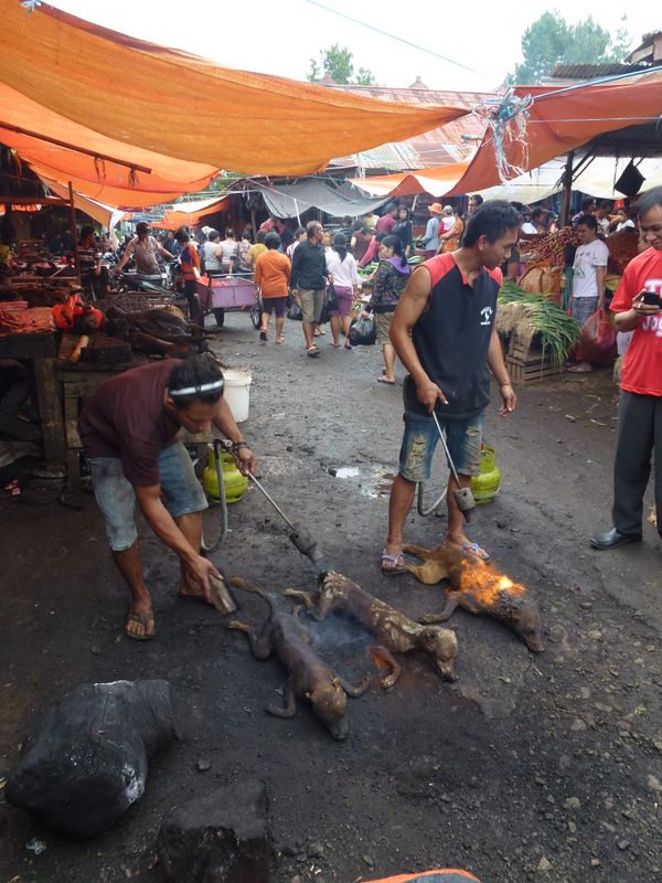 A strike with the wooden club killed these dogs, and instantly their fur is burnt away with gas burners