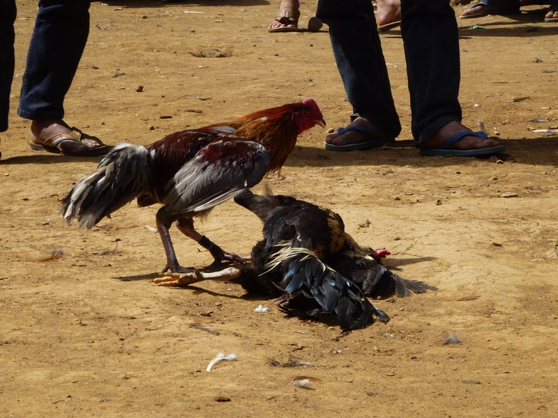 The fight ends with the death of one of the cocks