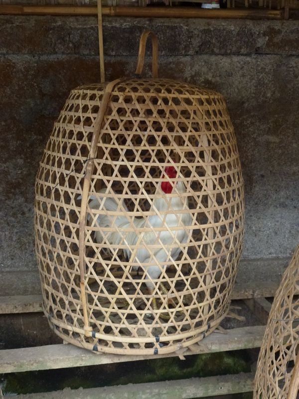 The cocks are kept in these baskets, because they get a massage every day! One day they will perform in a cockfight, and the massages are to make sure they get big and strong muscles...
