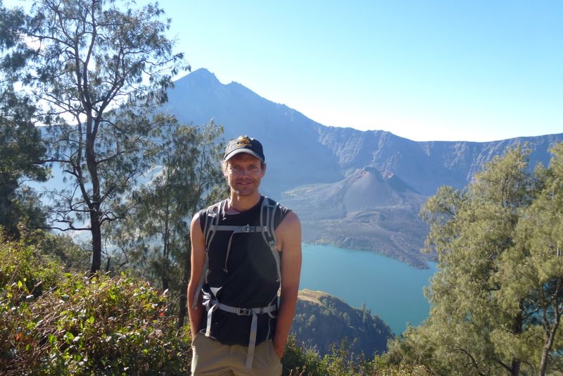 Morning of day two - with the trekking program in sight: walk down into the crater to the lake, and up again to the base of the left flank leading up to Rinjani summit