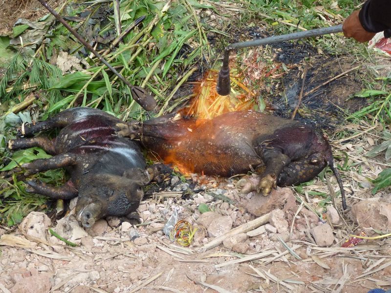 Once dead, the bristles are burnt off with gas burners...