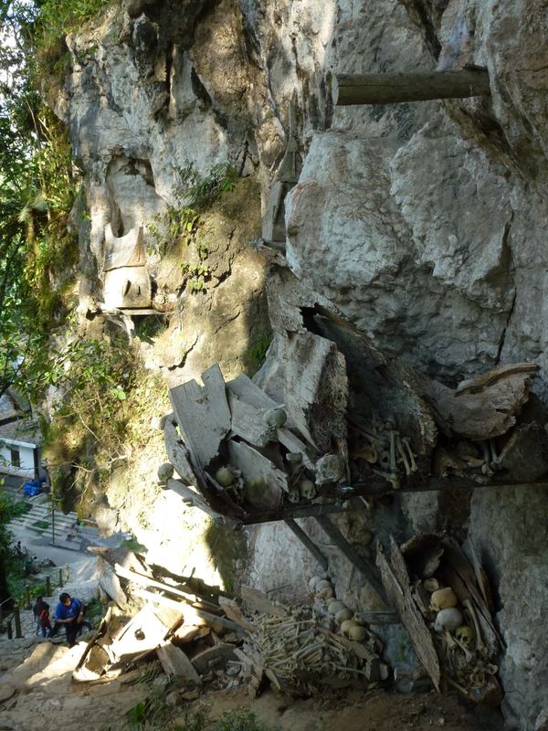 Before the local people were able to quarry holes into the rocks, the coffins were placed on wooden bars along rock walls...