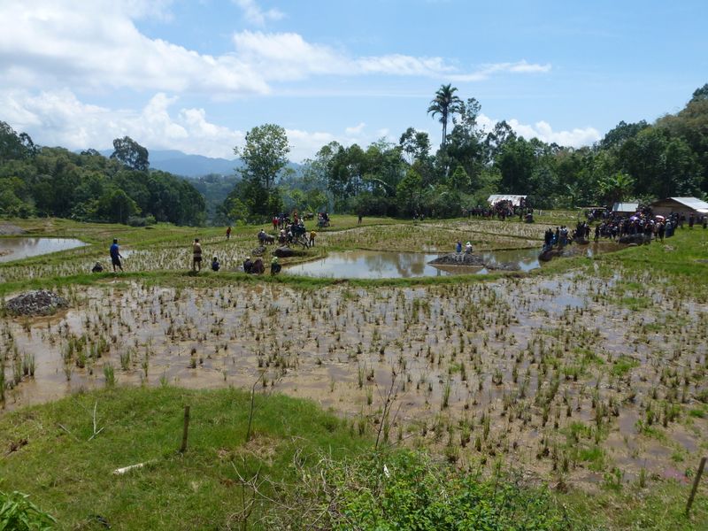 On day two of the funeral, buffalo fights take place in the rice fields around the village...