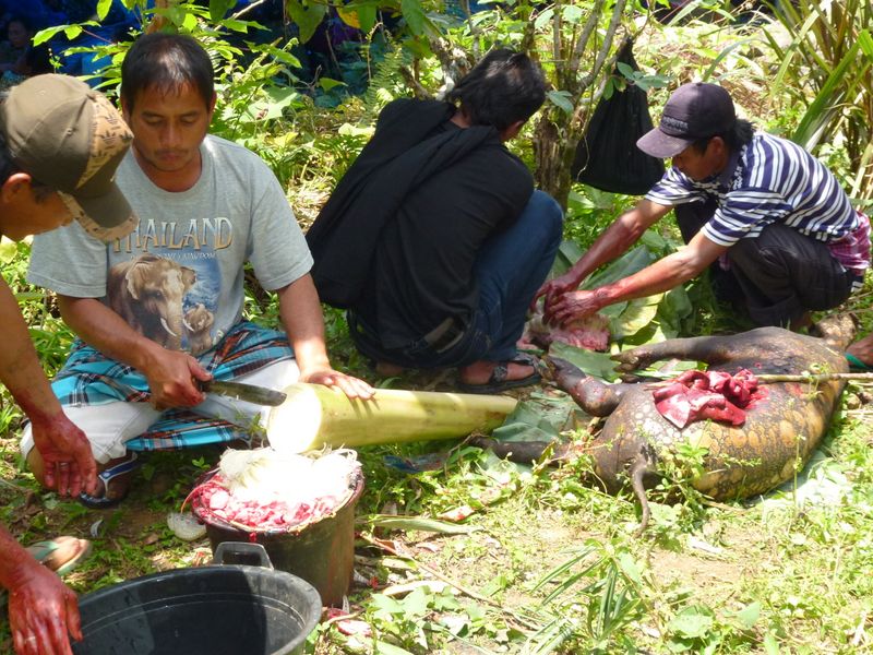 The intestines are cut to pieces, mixed with vegetables and spices and filled into bamboo poles
