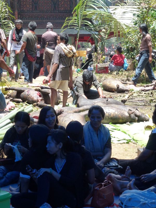 While the slaughtering goes on in the back, women and children don't let themselves be distracted - they go on chatting, playing cards and drinking tea...